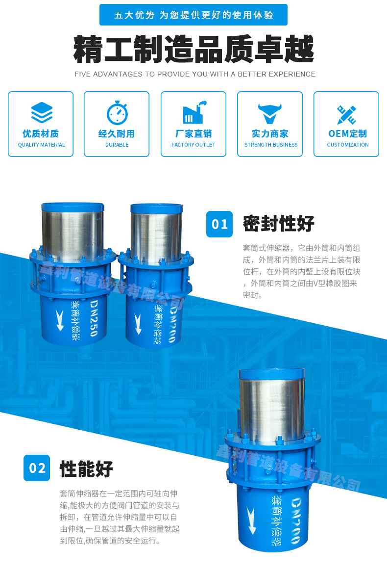 套筒補(bǔ)償器可用化學(xué)物質(zhì)建筑項(xiàng)目壓力≤2.5CPa,化學(xué)物質(zhì)溫度-40℃~600℃。套筒補(bǔ)償器采用-新型的橡膠制品軟性石墨環(huán),其具有抗拉強(qiáng)度大,摩阻小(0.04~0.10),不老化,功能強(qiáng)大,維修方便快捷等特點(diǎn)。